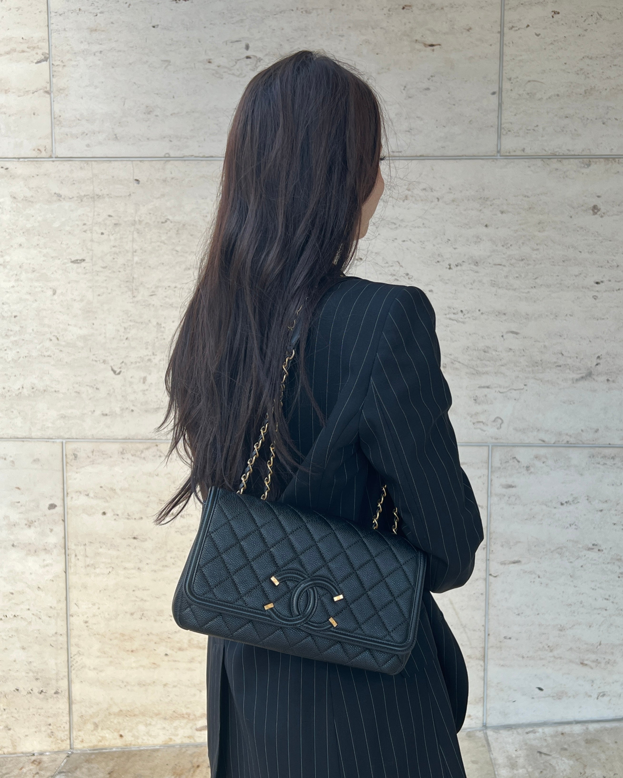 Chanel Black Quilted Caviar Leather Medium Filigree Flap Bag